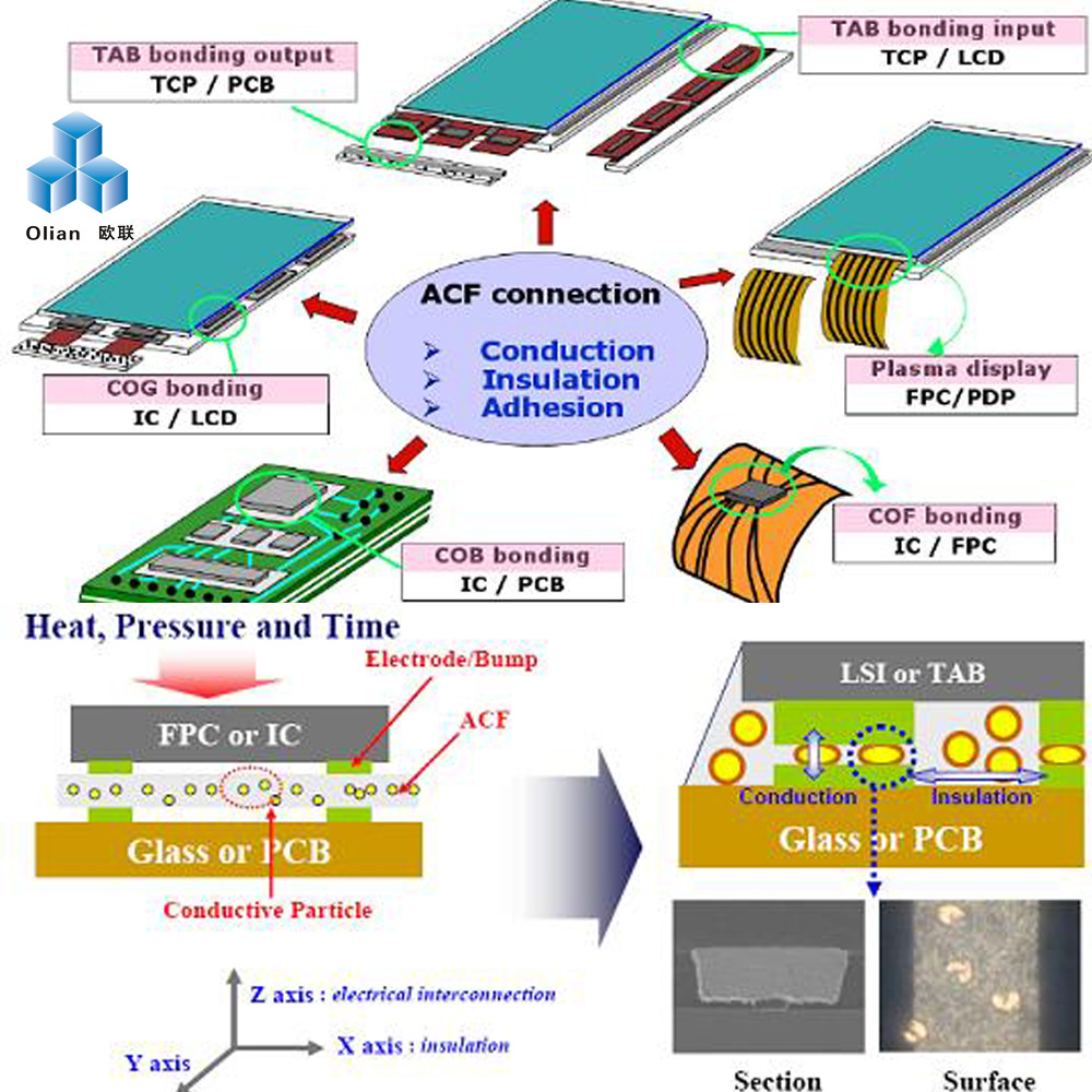 异方性导电胶膜(Anisotropic Conductive Film,简称ACF)由Sony开发,现广泛用于IC与LCD、FPC与LCD、IC与Film之间的压合绑定,以实现信号的传输与画面的显示。 ACF是同
