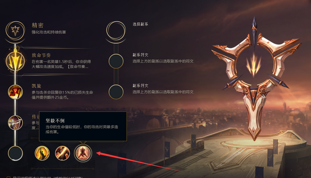 第二种推荐的是比较普遍的蛮王符文,选择精密作为主系可以增加蛮王的攻速,强攻增加蛮王3次攻击后的伤害,凯旋杀人或助攻后回血保证蛮王生存能