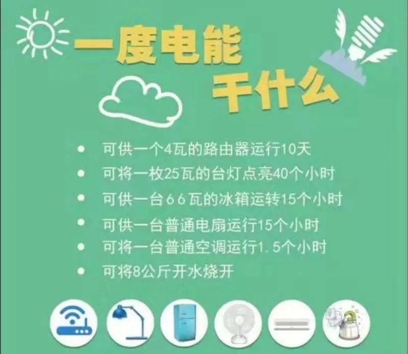 [最佳答案] 「1度电」就是耗电量1,000瓦特(W)的用电器具,连续使用1小时(h)所消耗的电量,表示为「1,000瓦特.小时(1,000Wh)」或「1千瓦特.小时(1kWh)」。其关系如下:1度电=1,000瓦特.小时(1,000Wh)=1千瓦特.小时(1kWh)。例:10瓦特的小夜灯,用电1,000小时消耗多少度电?答:10瓦特×1,000时=10,000瓦特.小时(Wh)=10千瓦特.小时(kWh)=10kWh=10度电。度跟瓦是不能直接换算的喔!