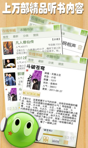 简介:郭德纲相声、精品评书、百家讲坛、有声小说、英语教学、儿童故事等等,均是按照听书爱好者的喜好精挑细选