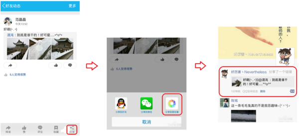 [最佳答案] 微信转发别人的说说和图片方法/步骤: 第一种,朋友圈分享的资源为链接形式的,这种资源文章是可以直接通过微信转发的,可以点击进去后,点击右上角有三个点图标,发送给朋友/分享到朋友圈等等。 第二种,朋友圈分享的资源为图片加文字形式的,这种资源只能保存图片,并且转发,文字信息暂时是不能转发的。 或者以这种形式转发:保存图片(长按图片 - 点击保存到手机),复制文字(长按弹出 - 复制),接下来正常发送朋友圈说说流程。 第三种,朋友圈分享的完全为心情文字类的信息,这类信息暂时是无法分享的。 或者以这种形