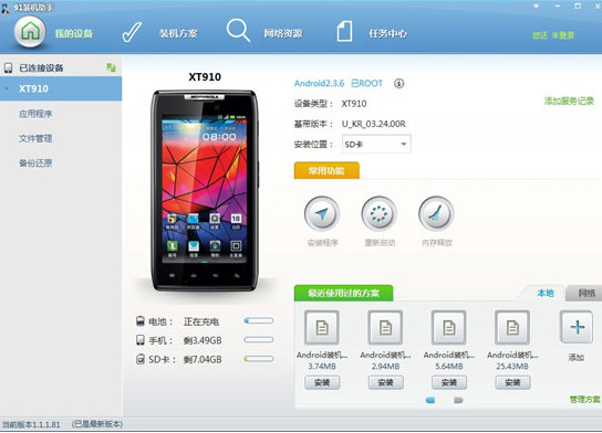 支持安卓和iOS 装机助手快速装机- 答: ▲装机助手主界面 装机助手大小仅有7M,界面简洁清新,手机连接也很快。装机助手能够同时提供16台智能设备安装,支持Android和iOS两大智能手机系统。同时,装机助手还加
