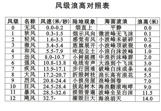 风级与风速对应表(本表所列风速是指平地上离地10米处的风速值)风级名称风速m/s陆地物象海面波浪浪高m0无风0-0.2烟直上平静0.01软风0.3-1.5烟示风向微波峰无,飞沫0.12轻风1.6-3.3感觉有风小波峰未破碎0.23微风3.4-5.4旌旗展开小波峰顶破裂0.64和风5.5-7.9吹起尘土小浪白沫波峰1.05劲风8.0-10.7小树摇摆中浪折沫峰群