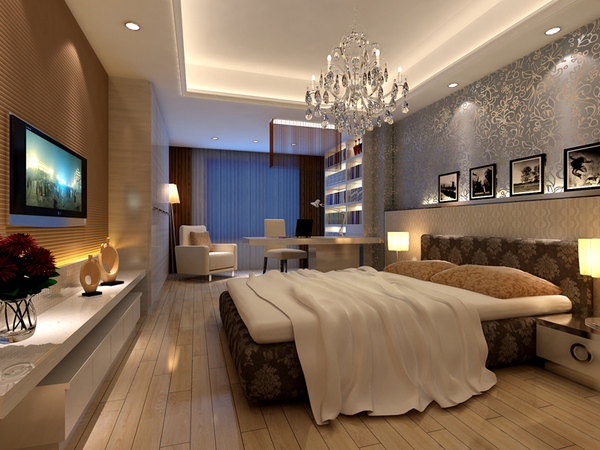 主卧效果图 双人床 电视 窗帘 家里装修图