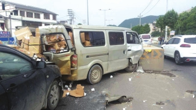 贵阳西南环线上 面包车撞上桥墩又被追尾