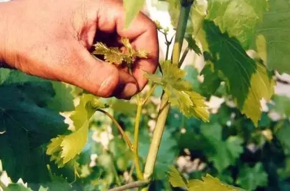 摘心后的夏芽副梢要多保留,可留6—8叶摘心,并结合扭梢限制生长。若延长梢长势强旺,可提前摘心,分散营养,避免徒长,也可不牵、不引任其先端下垂,减缓生长势。 葡萄的叶在