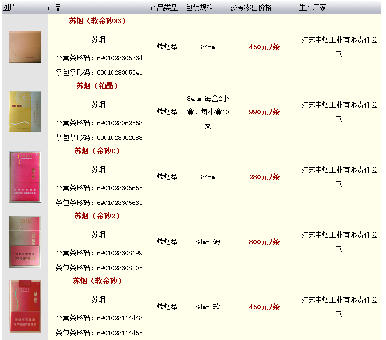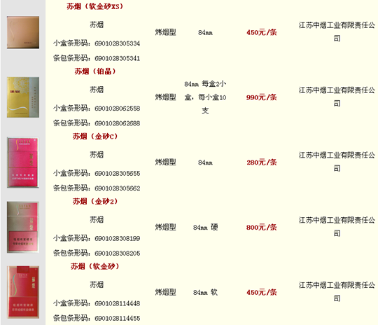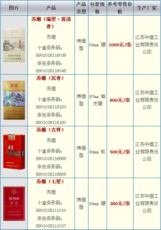 苏烟香烟价格查询一览 2016年苏烟价格表