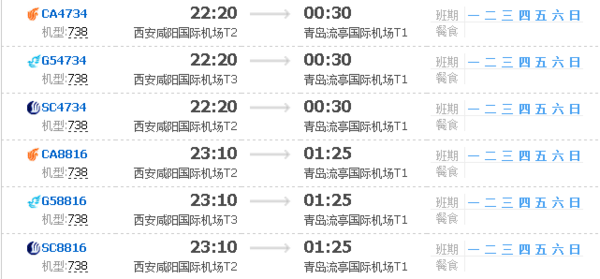 陕西省宝鸡市到青岛市的航班时刻表