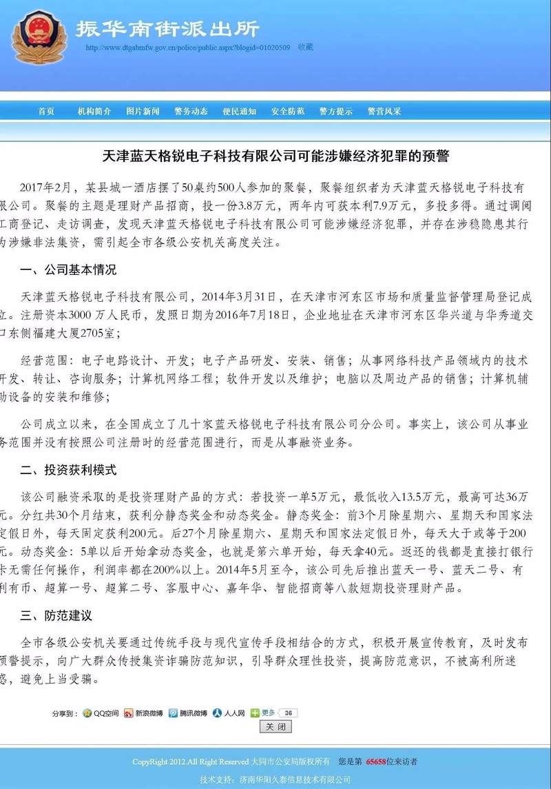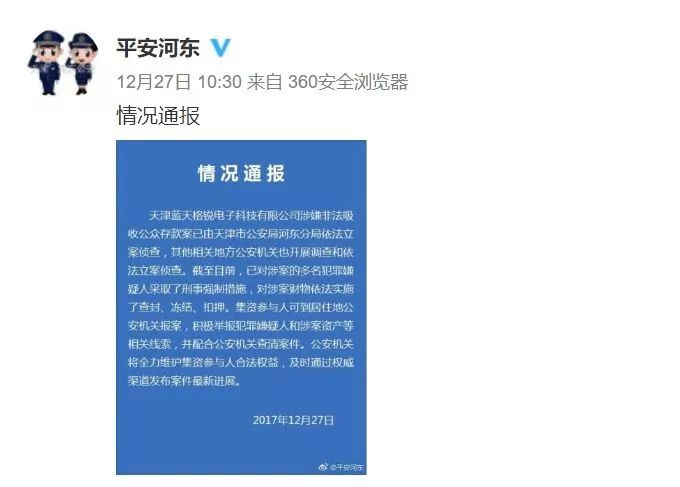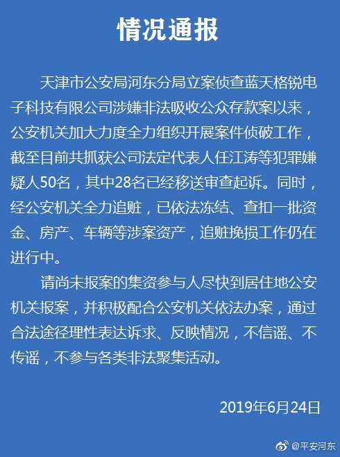 【通告】天津蓝天格锐涉嫌非法集资 已被