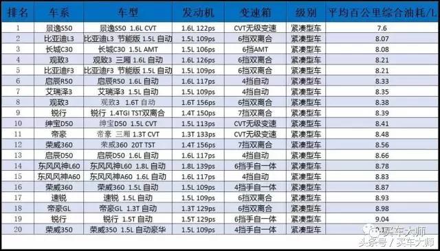 小熊油耗2017紧凑型车油耗排行榜之手动