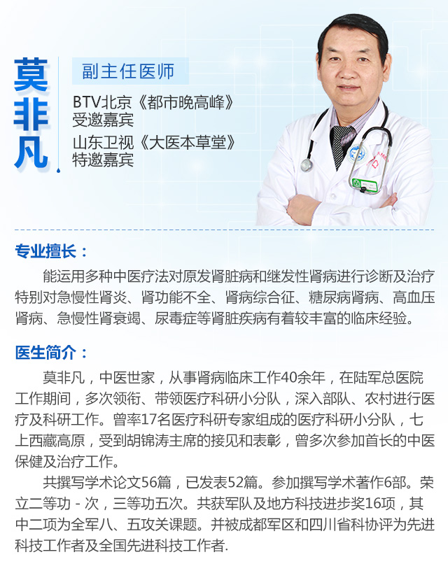 简介:莫非凡,执业医师,执业机构:北京联科中医肾病医院基本信息姓名:莫非凡执业证书编码:141110000001890执业机