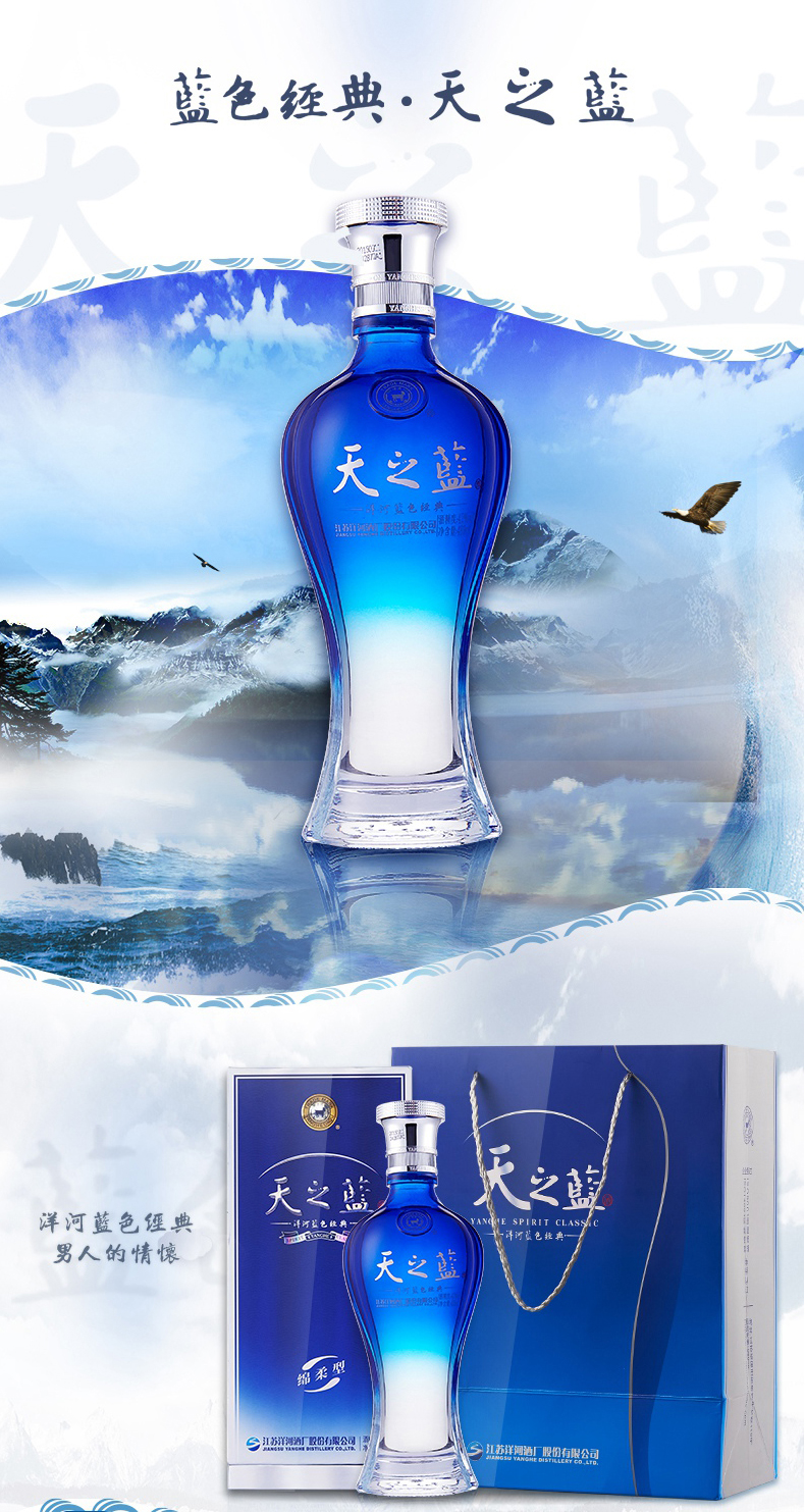 简介:让心灵超脱,笑看云卷云舒,坐品绵柔口感。天之蓝酒瓶也一改一袭天蓝外衣,三个银色的天之蓝字体如雄鹰般