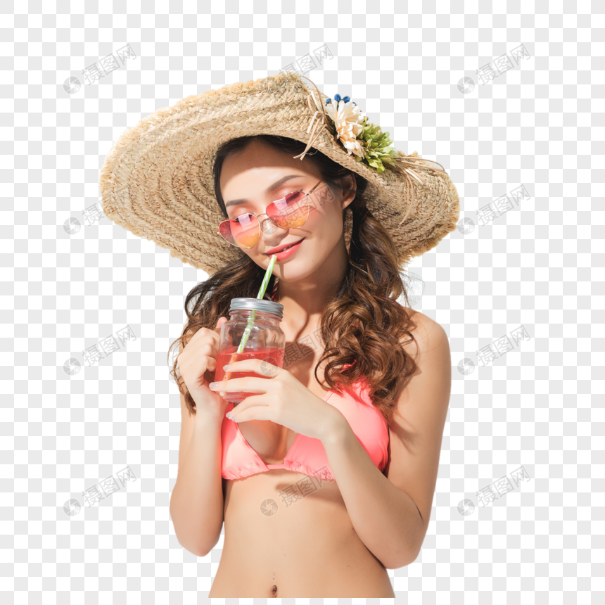穿粉色比基尼的美女头戴遮阳帽喝饮料
