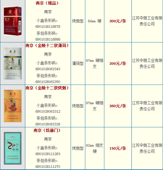 南京香烟有多少种?最新南京香烟价格表及