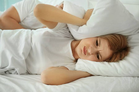 沮丧和紧张的女人躺在打呼噜的人附近