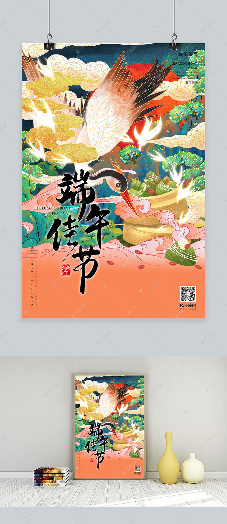 端午节仙鹤粽子橘粉色国潮风海报海报下载
