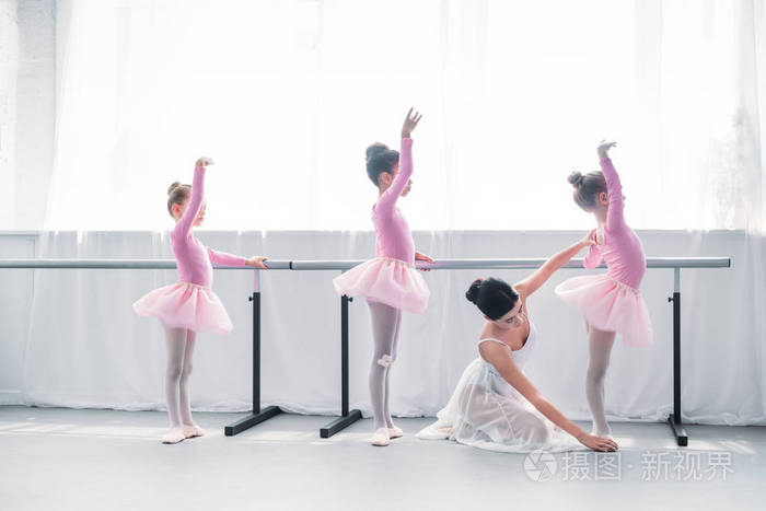 芭蕾学校青年芭蕾舞教师与孩子们一起锻炼的侧面观