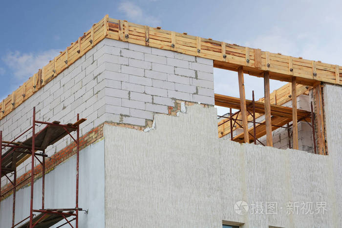模板。重建,建筑外墙外保温的施工。建筑保温和石膏、 脚手架。现代建筑未完成