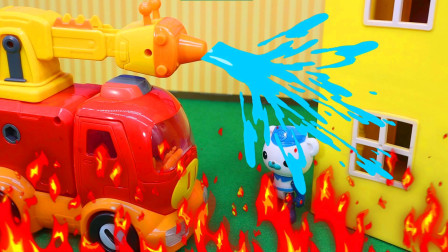 做饭厨房着火了 救援宝贝小鹿消防车灭火