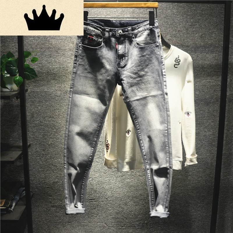 Hi MAN欧美简约复古灰色牛仔裤男士紧身