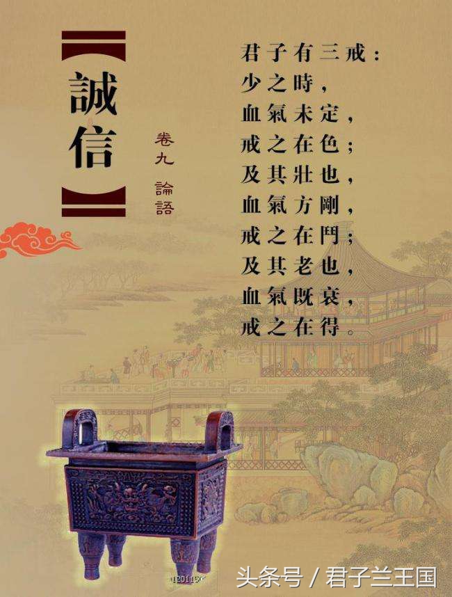 简介:君子有三条戒规:少年时应戒万事万物的诱惑;壮年时戒争斗;老年时戒贪图。出处:《论语·季氏》:"君子有三戒: