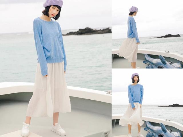 今年最流行的浅蓝色毛衣,搭配这4条裙子,