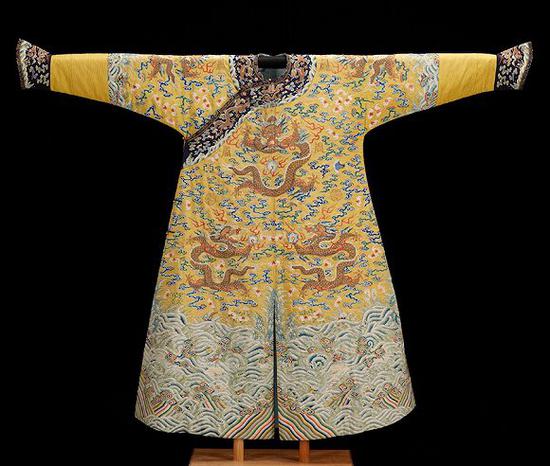 清十九世纪 黄缎金线绣十二章龙纹吉服