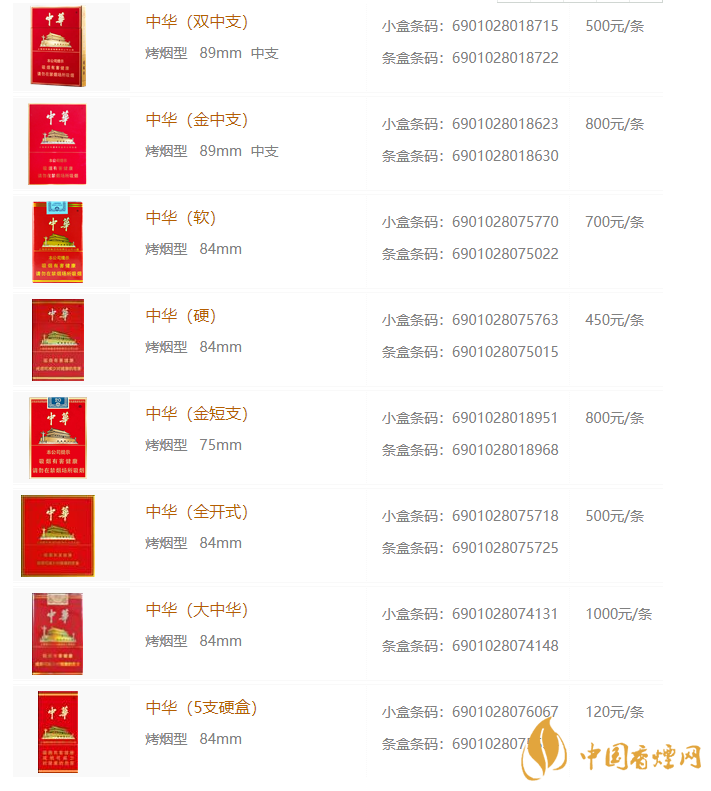 中华香烟2020最新价格表图大全 中华系列香烟多少钱一包?