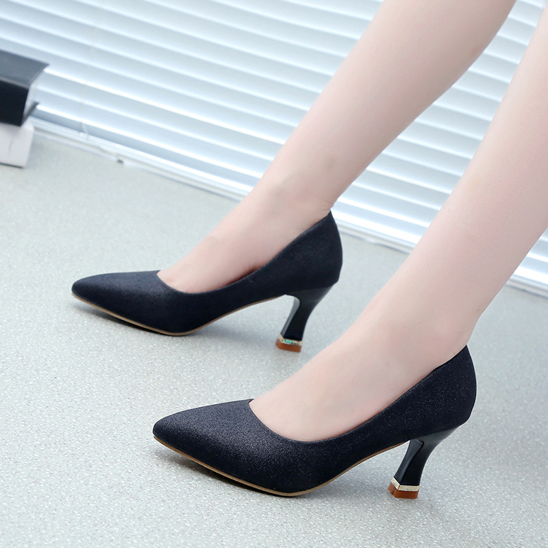 工作鞋女黑色高跟鞋女鞋职业礼仪细跟亮片女式皮鞋尖头单鞋中跟TCVV女士尖