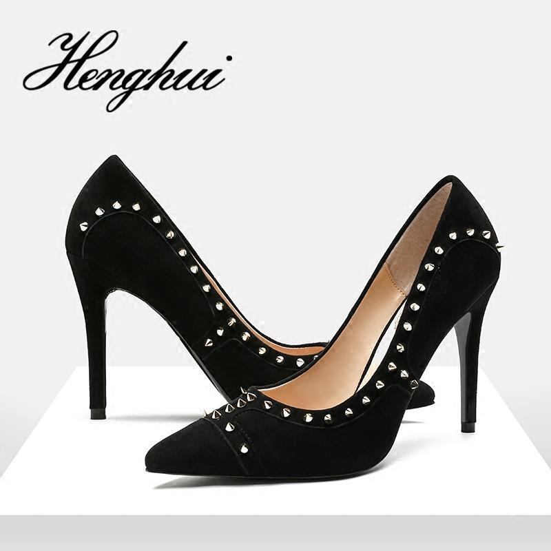 2018新款欧美铆钉尖头高跟鞋黑色细跟拼色性感浅口单鞋女小码娉语(PINGYU