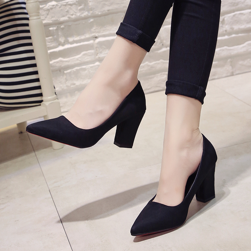 春秋款黑色尖头高跟鞋女粗跟公主鞋8cm女鞋绒面浅口工作鞋单鞋MAR PAIRS