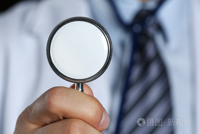 医学医生的手在他胸前头听诊器