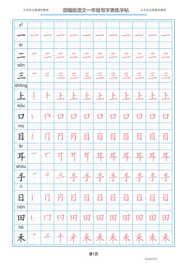 统编语文一年级下册钢笔、毛笔描红字帖,可以打印