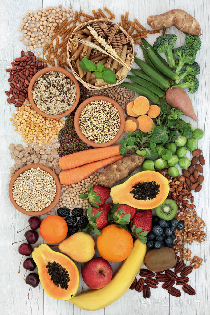 健康的高纤维食品, 有谷物, 豆类, 全麦面食,