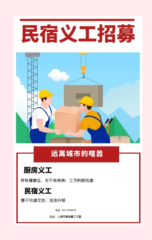 民宿义工招募 远离城市的喧嚣 厨房义工 民宿义工 持有健康证,无不良疾病;工作积极性高 善于沟通交流;活泼开朗 电话:021-12345678 地址:上海市图怪兽工作室 民宿义工招聘手机海报