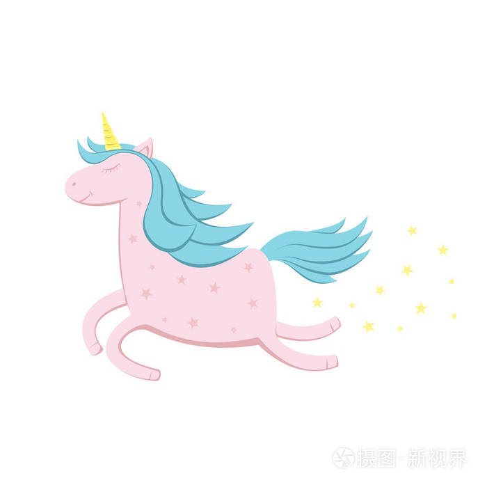 粉红色的独角兽与蓝色鬃毛和明星隔离在