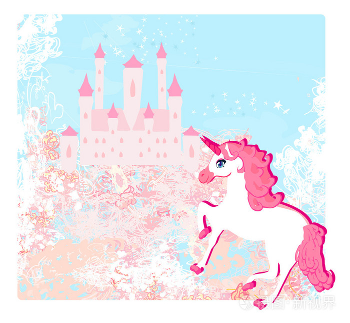 童话景观与粉红色的魔法城堡和独角兽