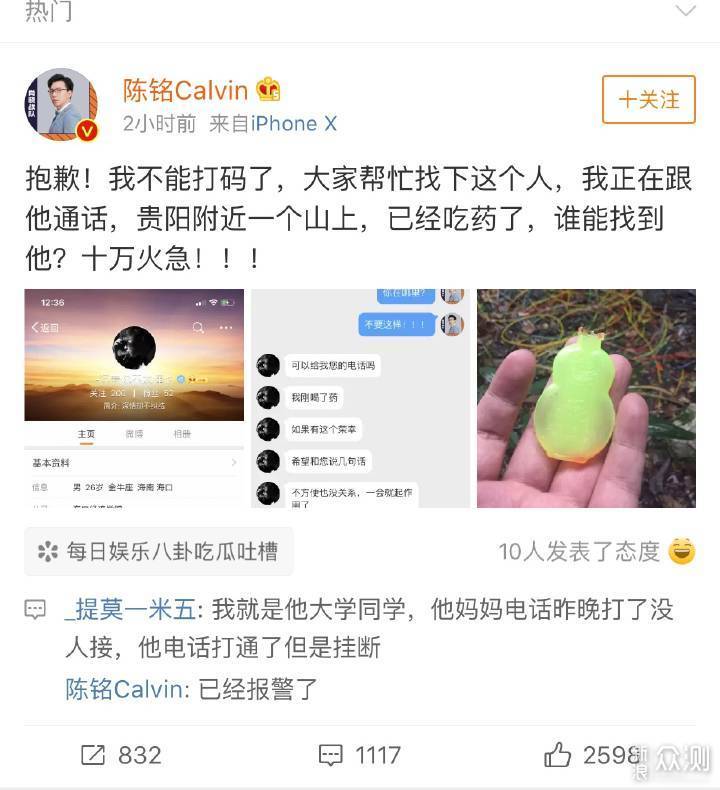 《奇葩说》陈铭发微博寻找自杀网友,警察