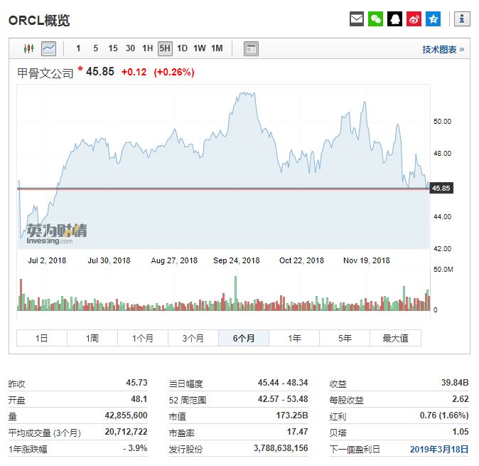 营收低于预期盘后甲骨文股价一度下跌逾3%