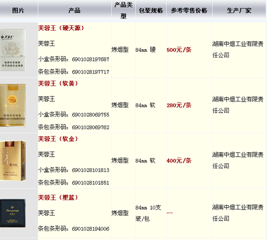 最新芙蓉王香烟价格表图片一览