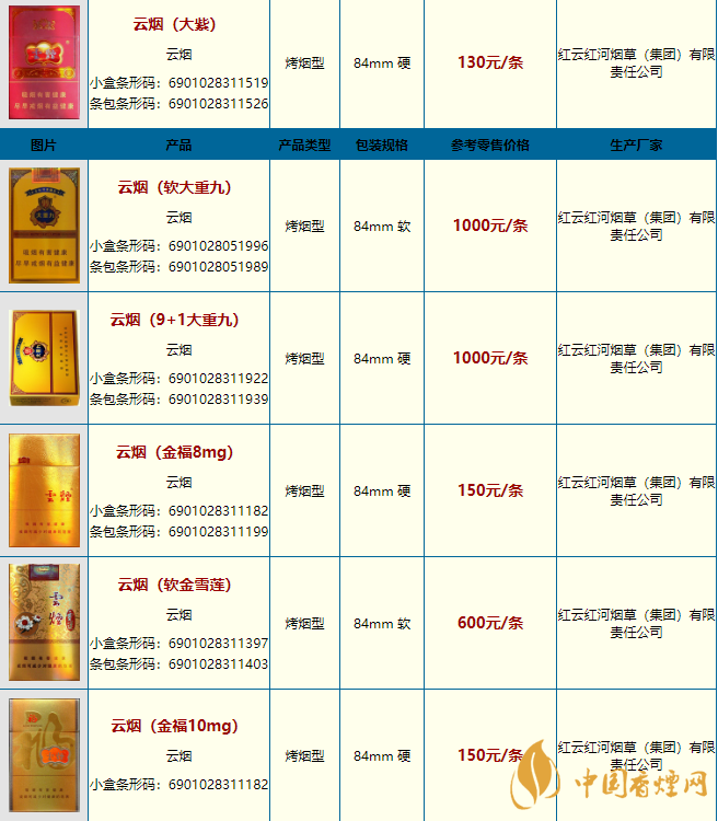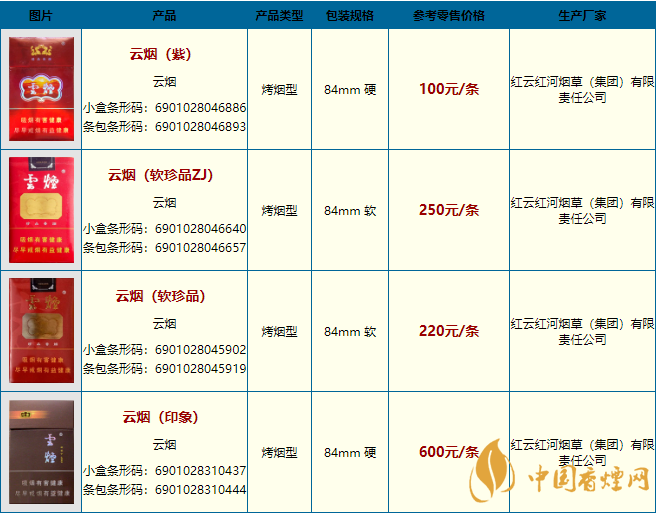 云烟所有价格表图片