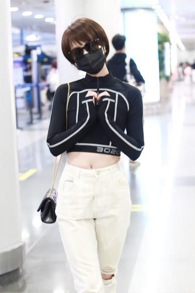 蓝盈莹黑色露脐上衣+白色牛仔裤简约热辣
