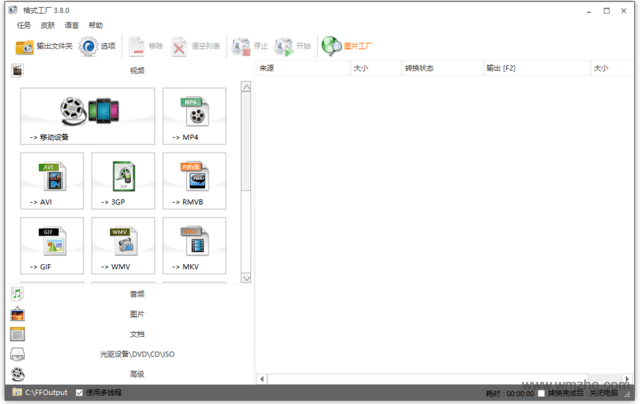 简介:格式化工厂提供所有类型视频转到MPG,AVI,3GP,FLV,MP4.所有类型音频转到MP3,OGG,WMA,M4A,WA