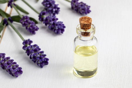 熏衣草精油在一个美丽的瓶子在桌子上