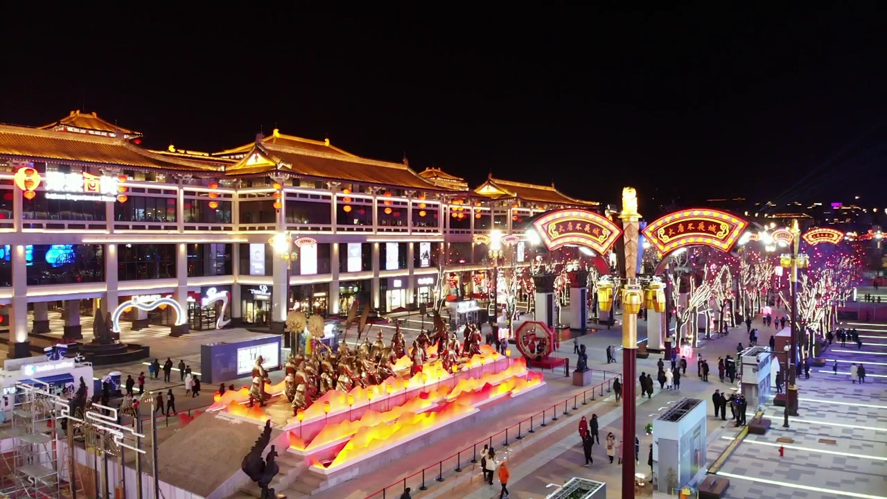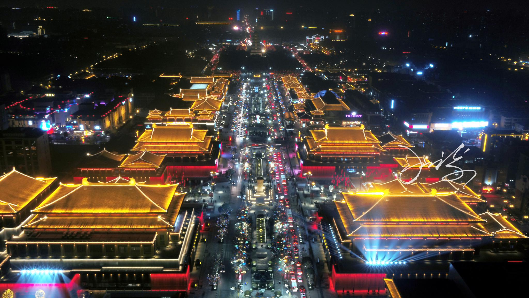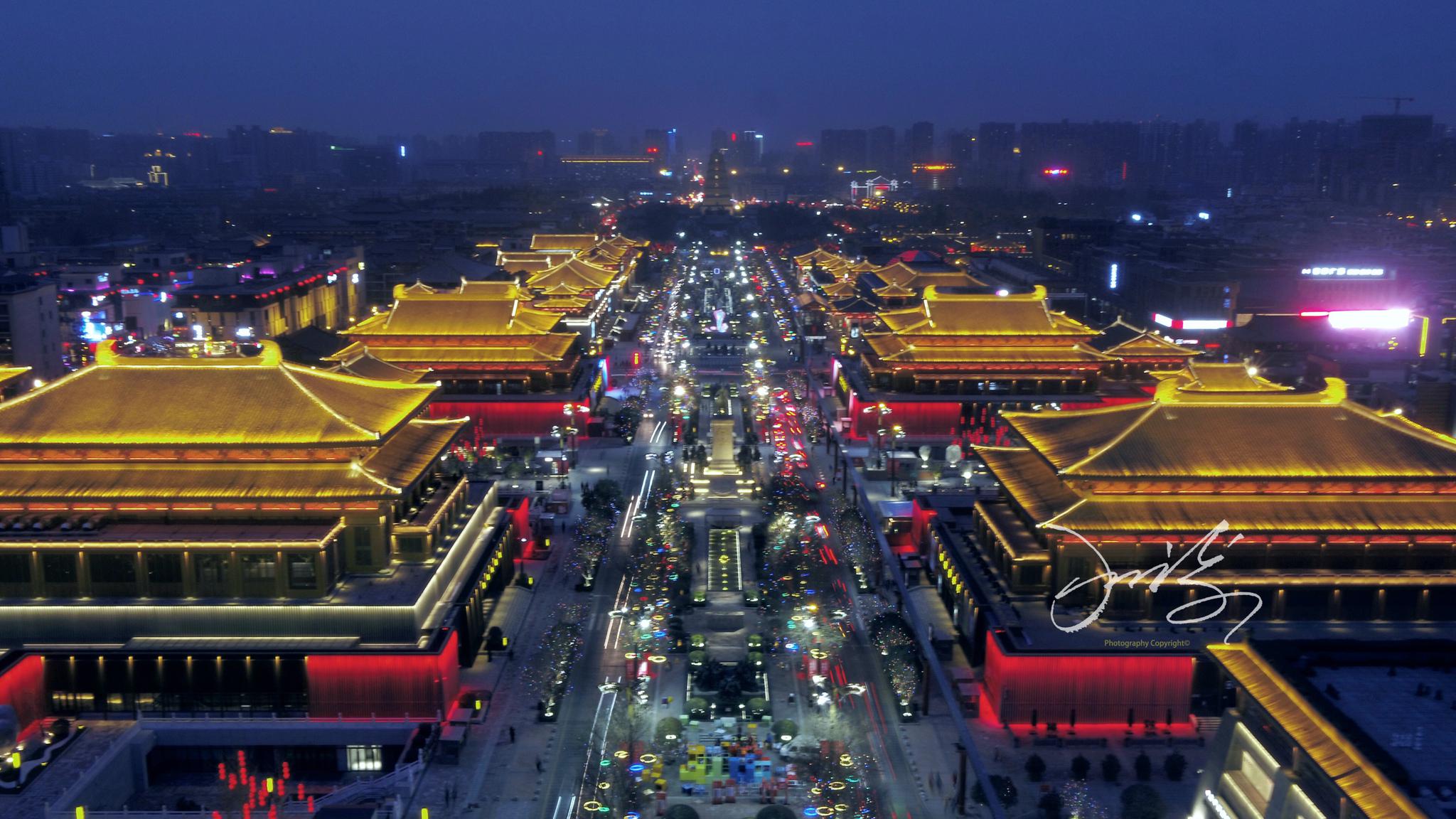 西安曲江大唐不夜城的夜景璀璨迷人,从航拍的角度看,太美了!