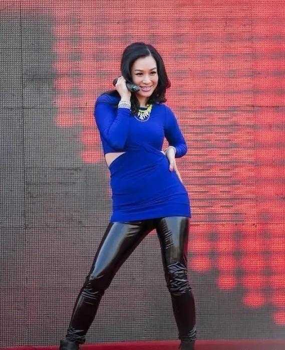 钟丽缇真会穿,蓝色包臀裙配黑色皮裤大秀