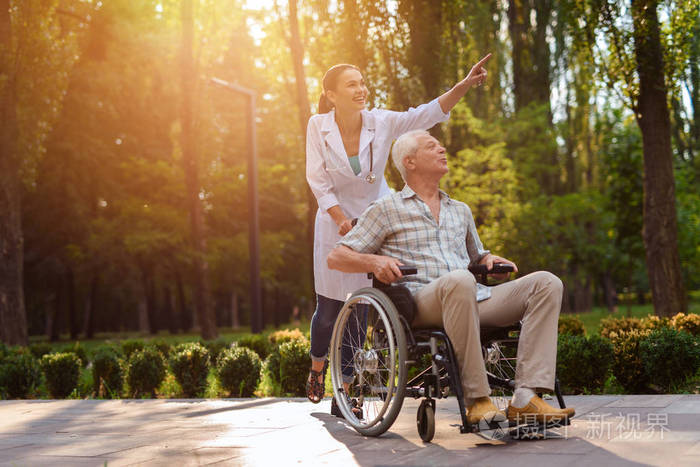 在公园里坐在轮椅上的老人。医生探查老人的肘部。