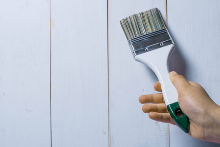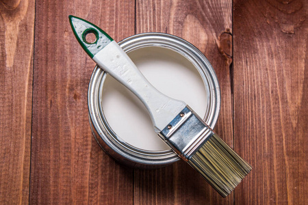 白色油漆刷子和一罐油油漆白色木制的桌子上