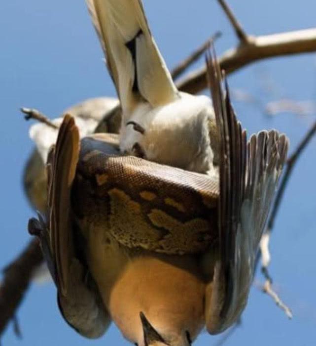 一只老斑鸠在树上休憩,一条蟒蛇悄悄靠近,