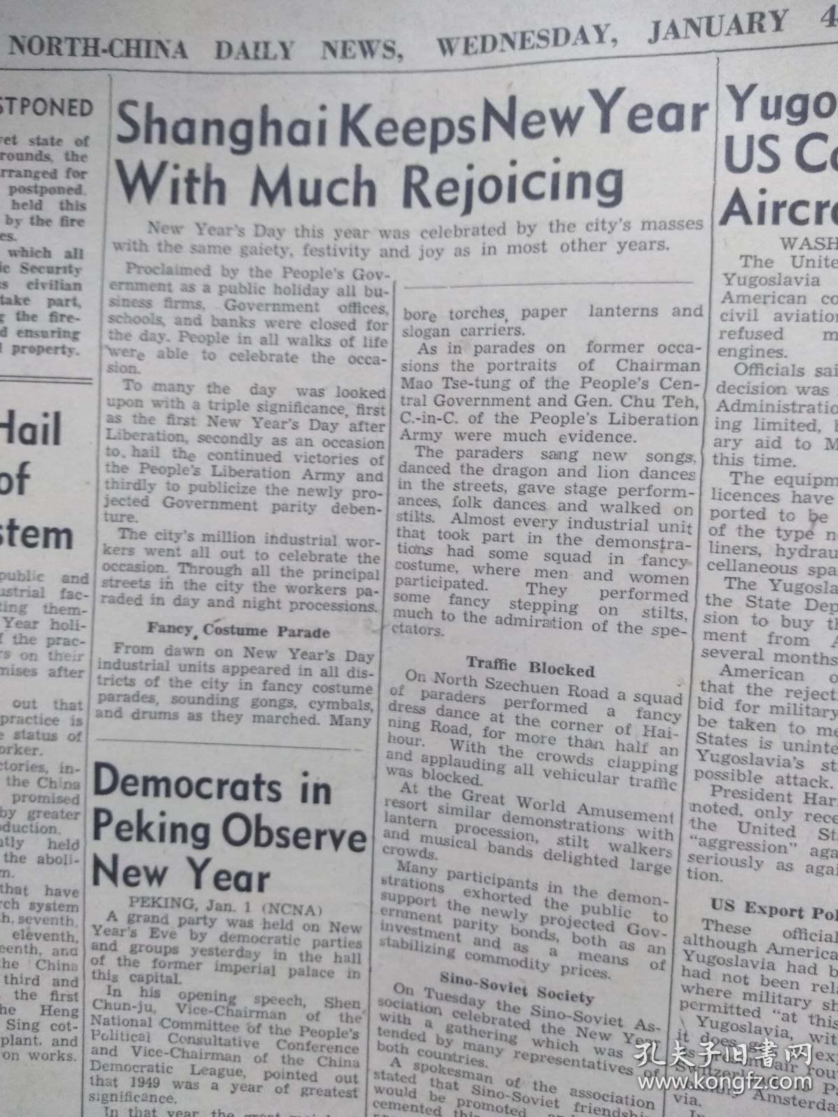 North-China Daily News,字林西报-北华捷报(英文,英国人在中国出版的历史最久的英文报纸)1950年1月4日,刘伯承所属部队已集结昆明郊外,昆明城东三镇解放,西南前线在成都东南的国民党17军,新7军和76军大部被解放军击溃,成都被解放,17军司令周文涛被俘,三台被解放,上海欢庆元旦,华东农业展览会元旦开幕,上海田联举办的元旦越野赛前三名,附照片,中国印刷新年画